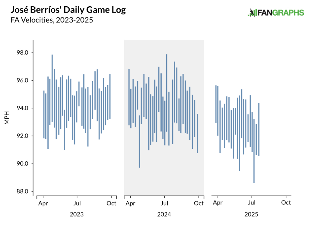 As the Jays look for pitching help at the deadline I’ve done a bit of a 180 on Keller. I was very much against dealing for him, thinking his solid but pedestrian numbers in a pitchers ball park would inflate heavily coming over to the AL East. And while those are real concerns, my bigger concern has become Berríos. While the numbers on the surface look solid enough with a 3.87 ERA and 4.29 FIP, the velocity drop he’s been experiencing keeps being a huge red flag. He’s down more than a mile an hour and it’s been a steady trend down as the seasons progressed.